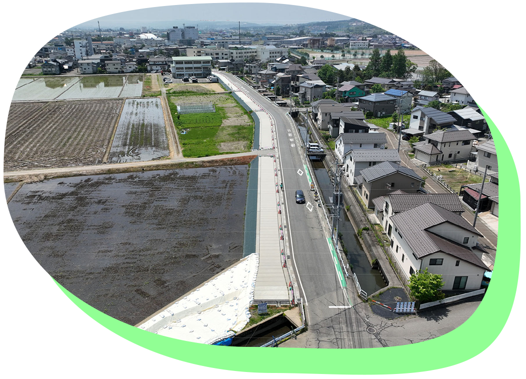 7号幹線用水路は、河川から水田などの農地に水を運ぶため人工的に作られた水路です。当工事では傷んだ用水路を改修し、用水路の上部に歩道を新設することで近隣の皆様が安全に通行できるための工事をしています。