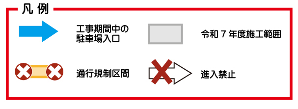 | 工事期間 | 片側交互通行規制 令和7年7月28日~ 8月 8日(8時30分~17時) 通行止規制 令和7年8月18日~10月31日(8時30分~17時) 片側交互通行規制 令和7年11月 1日~12月26日(8時30分~17時) |