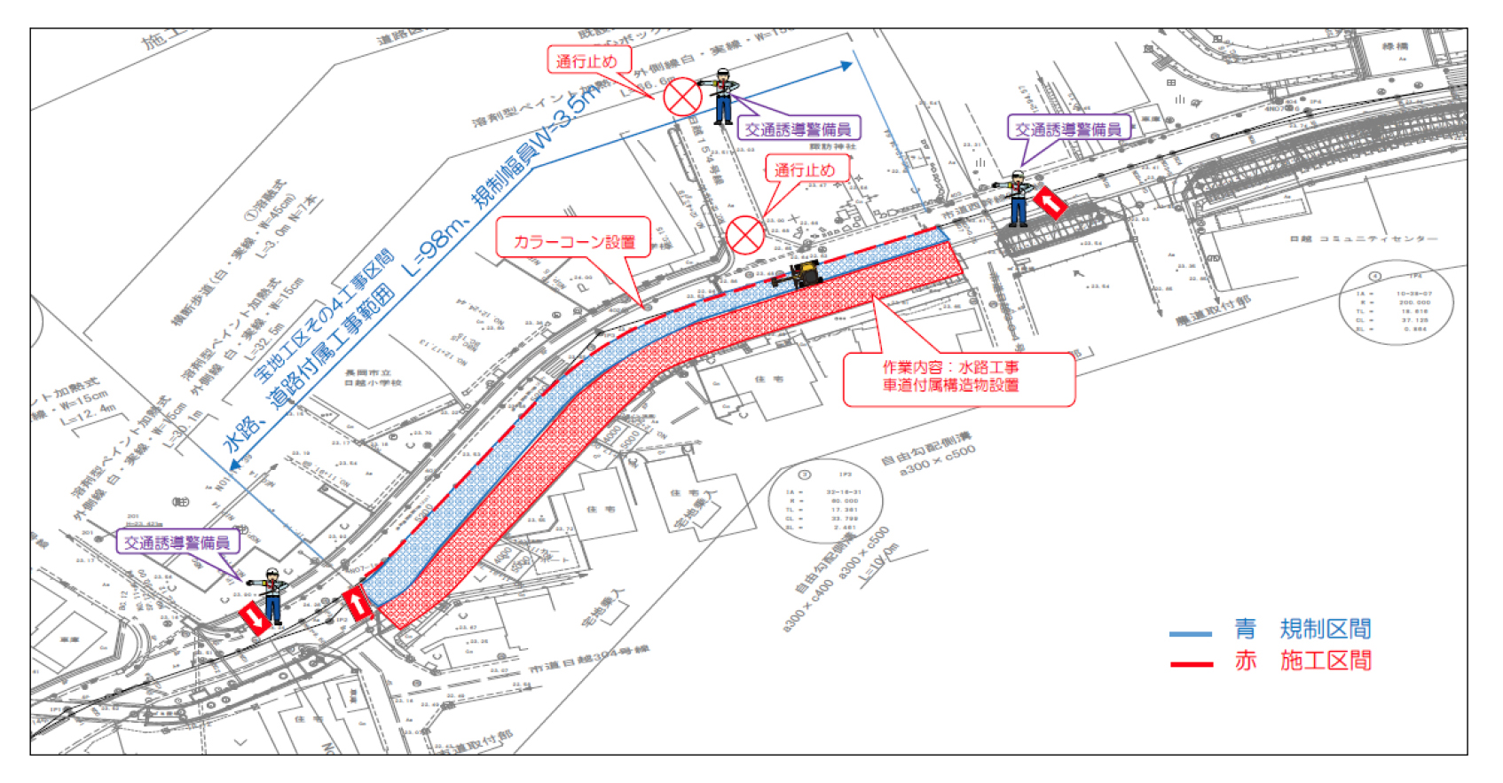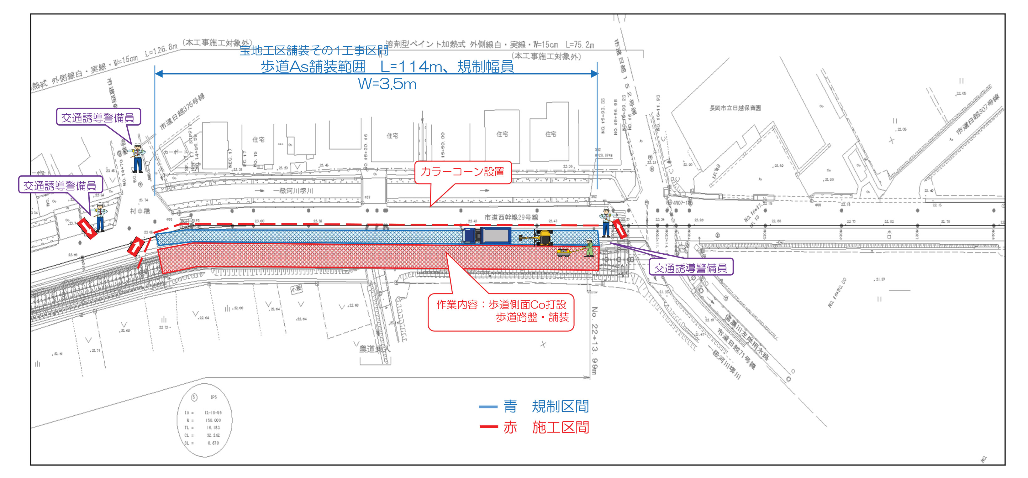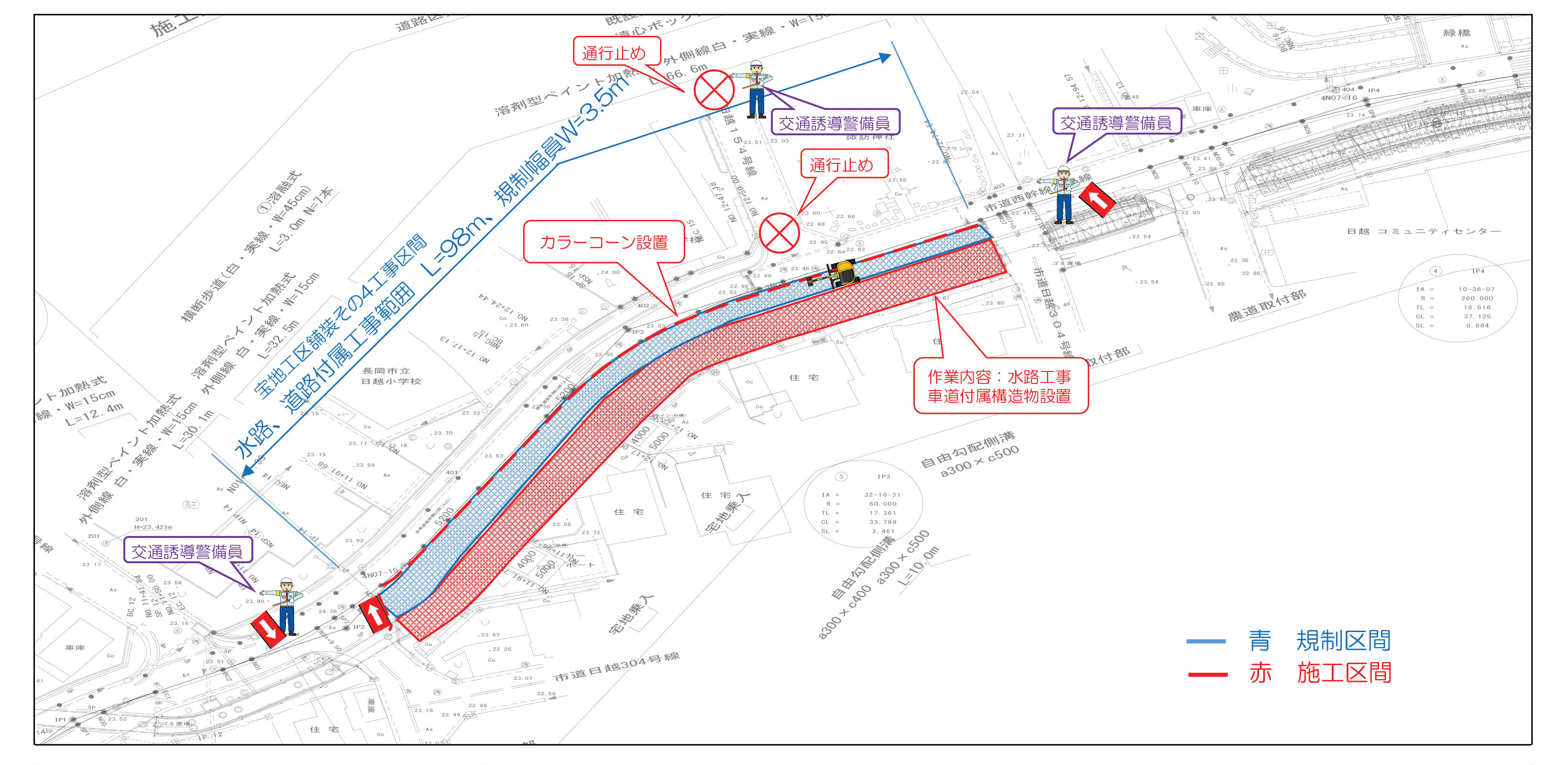 規制時は工事看板を設置するとともに交通誘導警備員により誘導いたします。