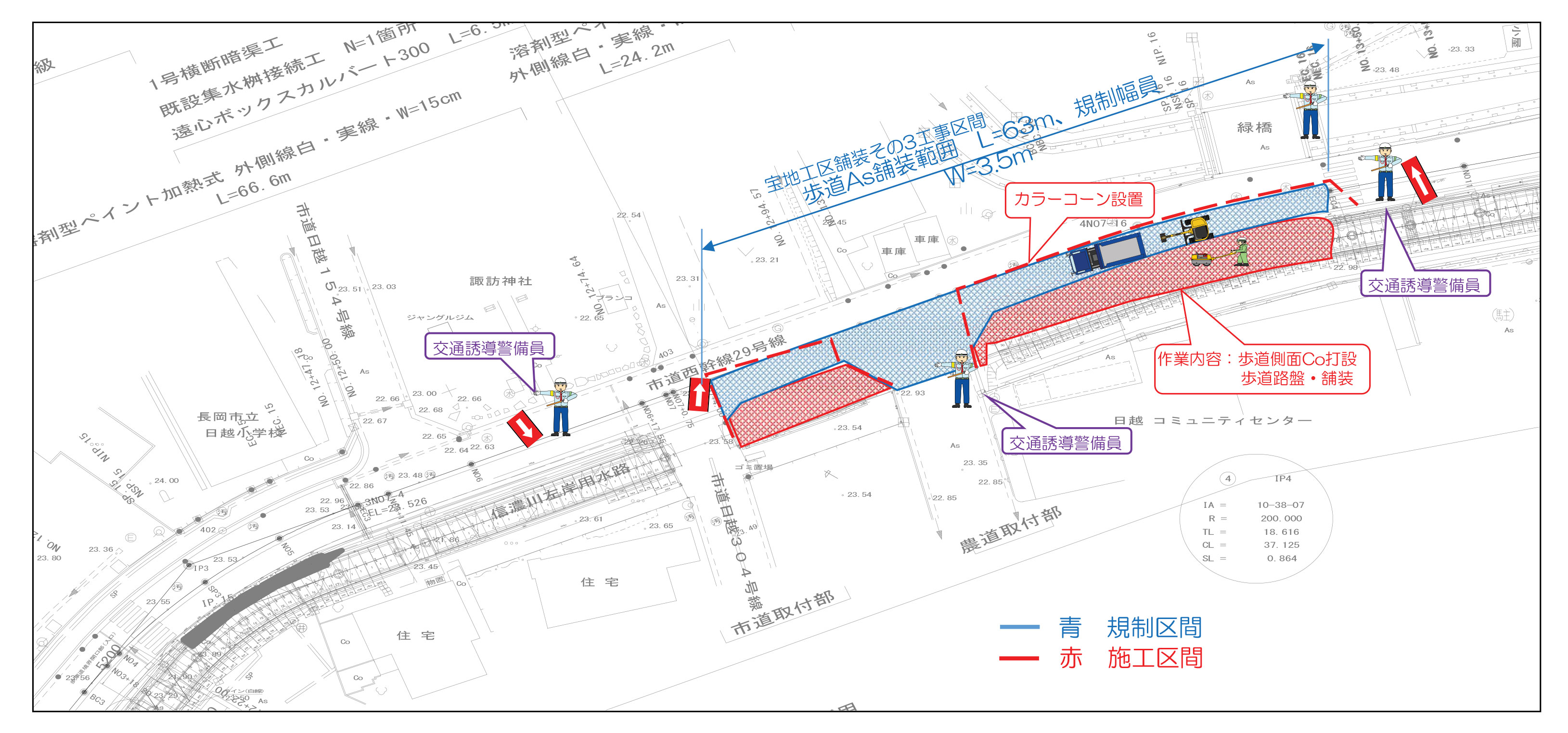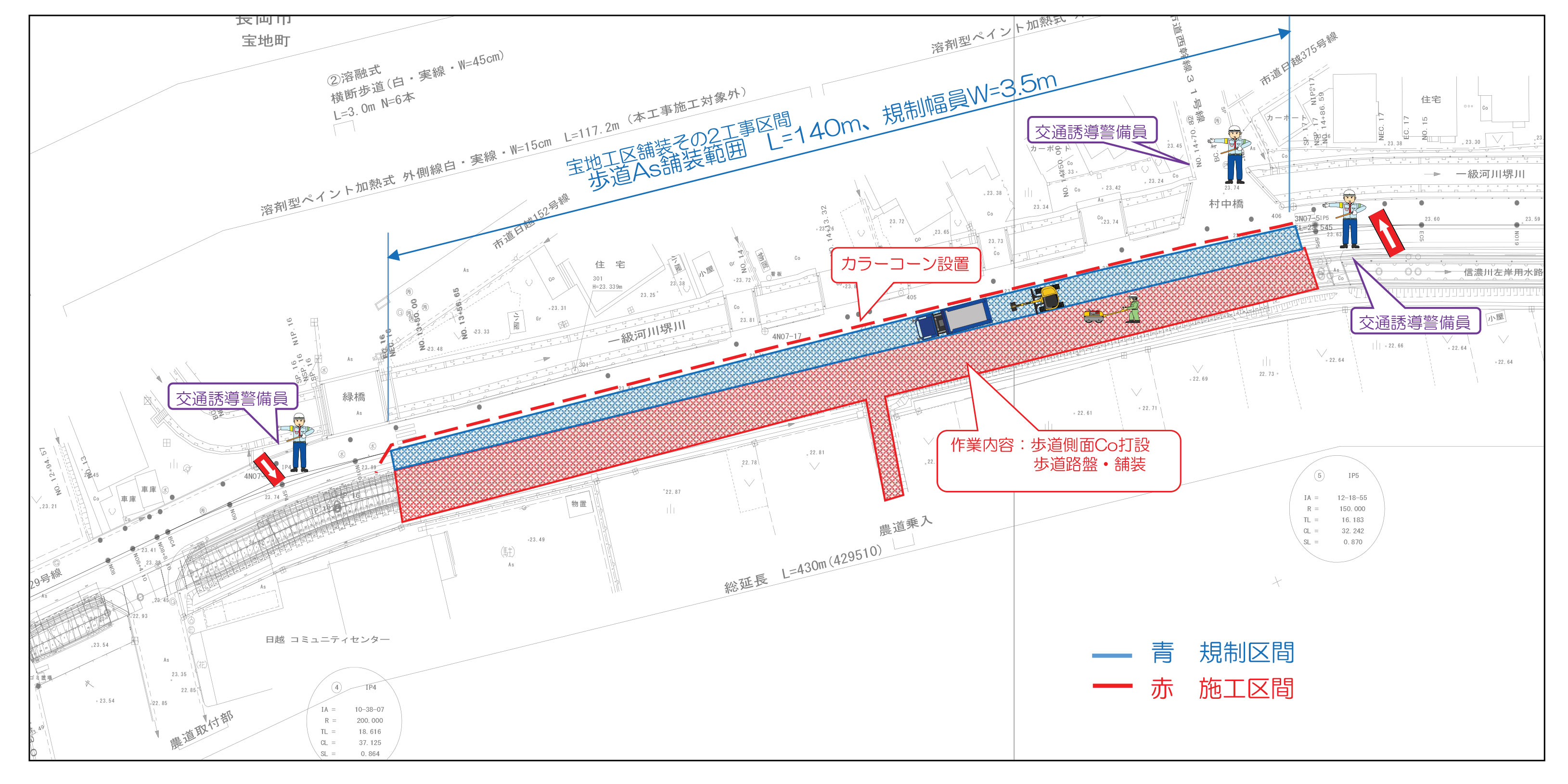 歩道舗装施工延長が長い為、片側交互通行規制を4分割し、施工します。
